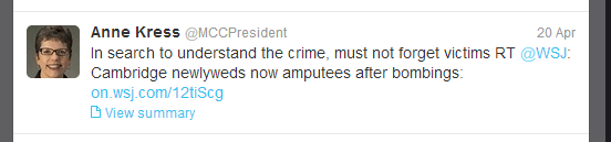 2. Tasteful social media posts related to the event can show compassion. Messages of hope and support can be appropriate, especially from university leadership. Anne Kress, president of Monroe Community College in Rochester, and  frequent tweeter , sent several messages of compassion during the Boston tragedy including the following: