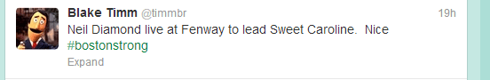 3. Highlight events and posts that will facilitate calm and healing. Even though this sounds a little bit fluffy, remember that many in your audience–including students, parents and alumni–may be separated from family and friends. Tasteful social media posts can create stability and comfort in a tragedy.  When Neil Diamond showed up at Fenway Park to sing the anthem of Boston Red Sox fans (Sweet Caroline) college coaches, athletes and sports information directors retweeted the show of solidarity. Diamond flew to Boston on Saturday specifically to sing the song as a surprise to rally support for Boston.