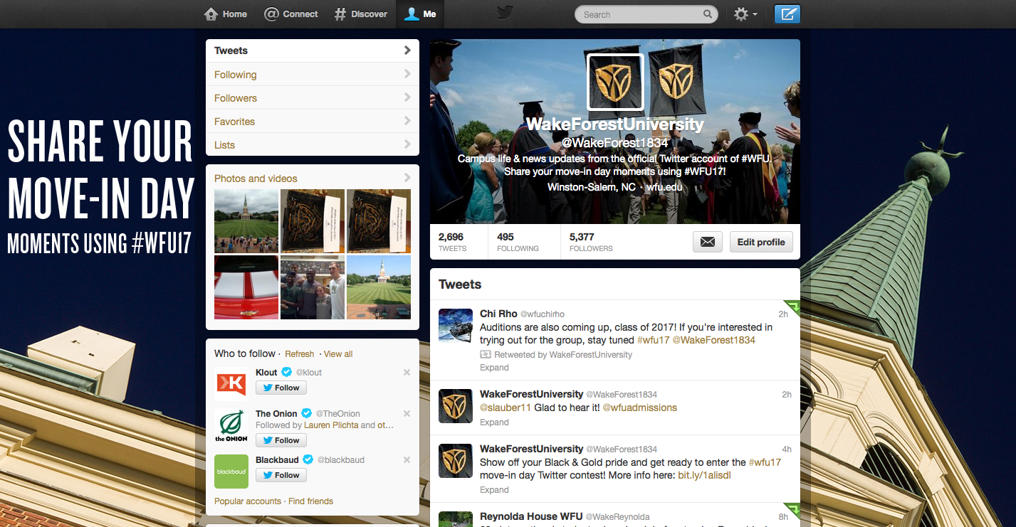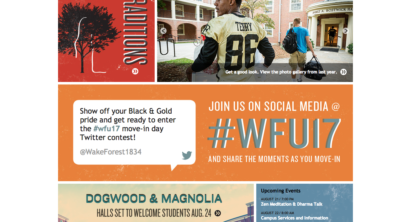 At Wake Forest University, freshmen arrive early and go through five days of orientation programming prior to the start of classes. Move-in day is a special time to celebrate the freshmen and make them feel a part of the campus community. From print media (Wake Forest mailed an actual book about being a freshmen to the class of 2017) to orientation programming, there are a number of ways Wake welcomes new students to “the Forest.” Social media is also an important part of these efforts.