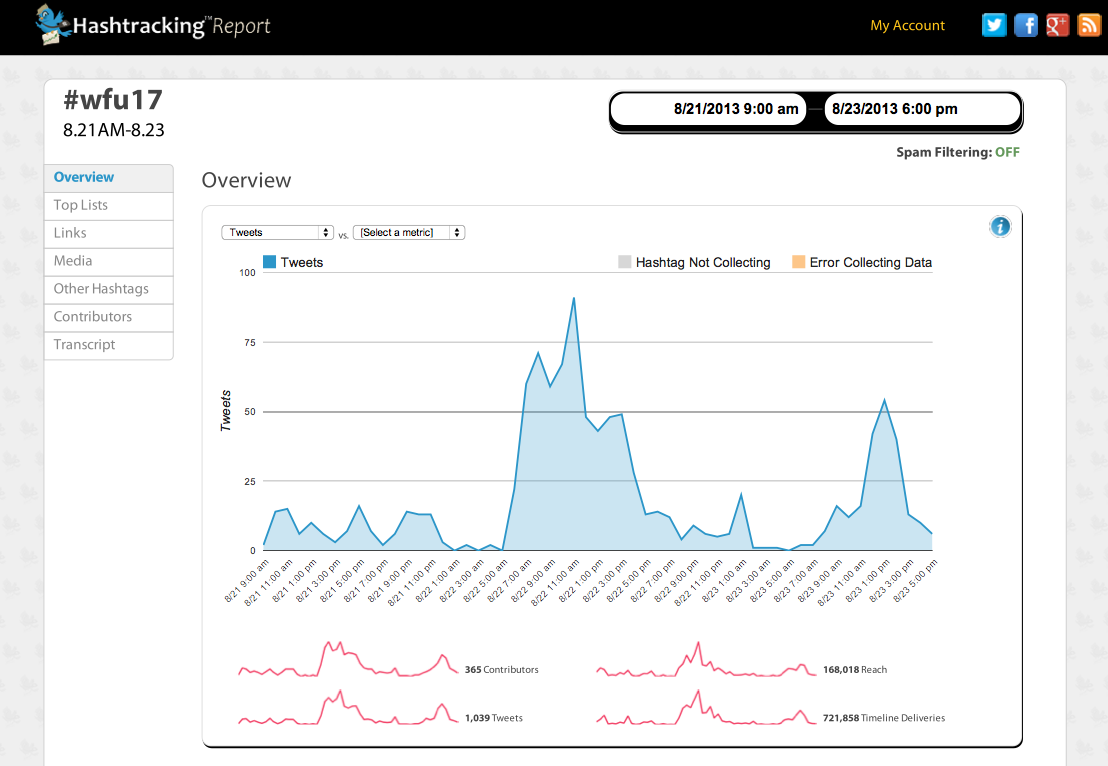 I had originally planned to track activity only on move-in day, which took place on Thursday, Aug. 22. I took “status” screenshots of our accounts at 6 a.m. and again at 11:55 p.m. I used the service Hashtracking which provides detailed reports for a specified time period as long as you have been tracking the hashtag within its system during that time. I created a corresponding Hashtracking report so that each measure of success would be assessed during the same time period.