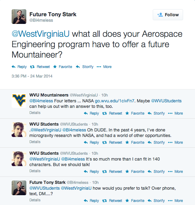 Here is an example of how our institutional personality works. We have a student-run Twitter account: @WVUStudents. Each week, a new student takes over. It’s hard for conversations not to be genuine, since it’s about students being themselves. One week, a student who was very passionate about space took over the account. It led to this interaction: