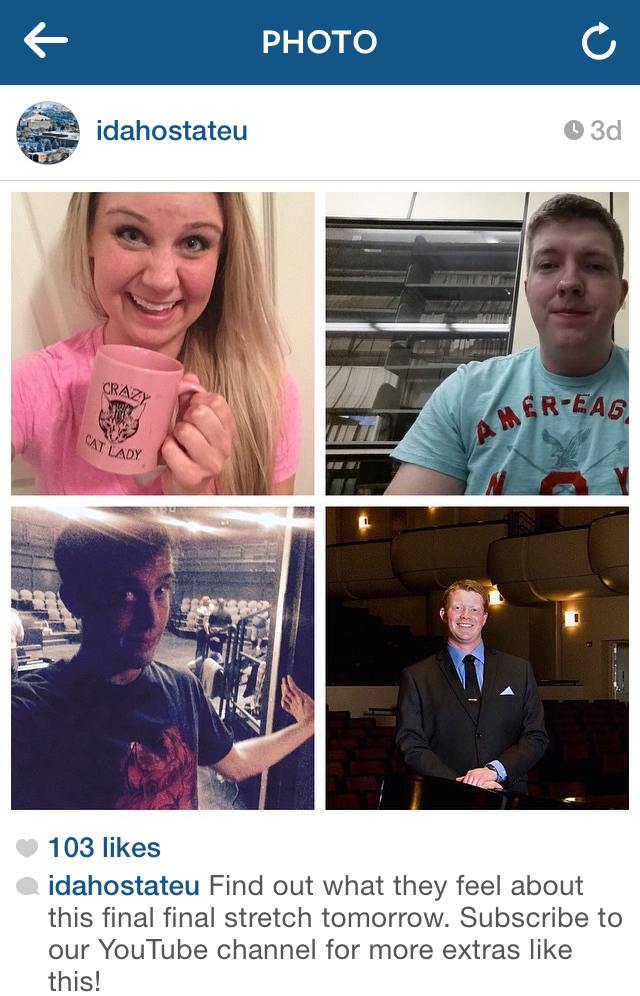 The eight-week series was designed to capture the rollercoaster of emotions leading up to graduation. Each week, the participants are given a prompt based on the week’s video topic (Week 1: This Crazy Crazy Thing, Week 2: Spring Break, Week 3: The Final Stretch and Week 4: Staying Sane).