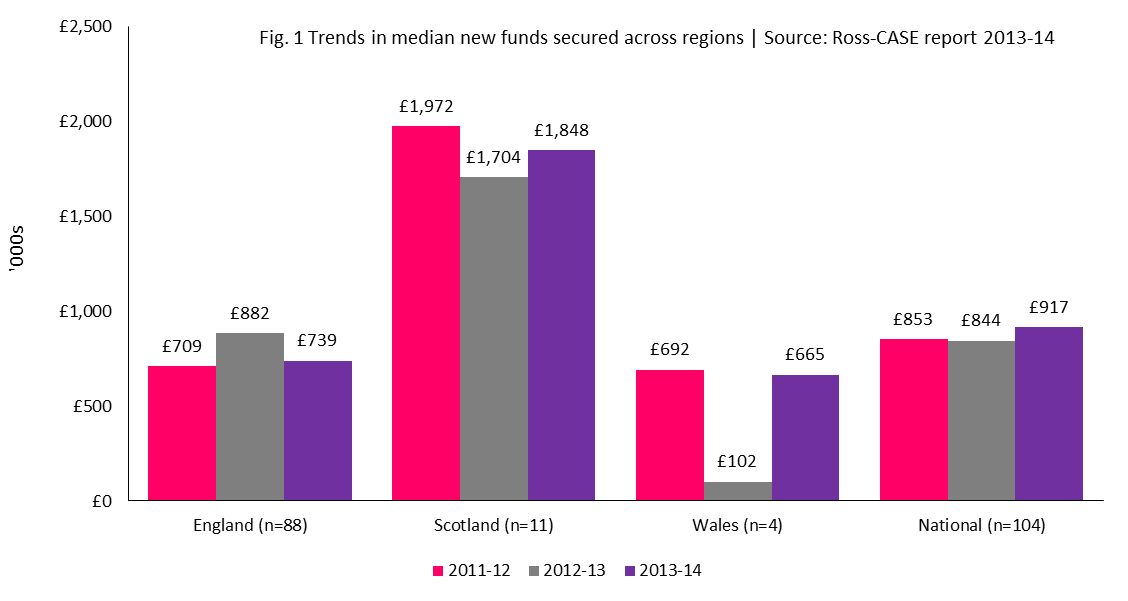 Findings from the latest Ross-CASE Survey of Charitable Giving to Universities in the UK 2013-14 signify a positive trend in philanthropic support received by UK higher education institutions. New funds secured reached an all-time high of £807 million (£734 million in England, £54 million in Scotland, £13 million in Northern Ireland and £5 million in Wales) while cash income increased slightly to reach £658 million (£599 million in England, £39 million in Scotland, £16 million in Northern Ireland and £3 million in Wales) in 2013-14.