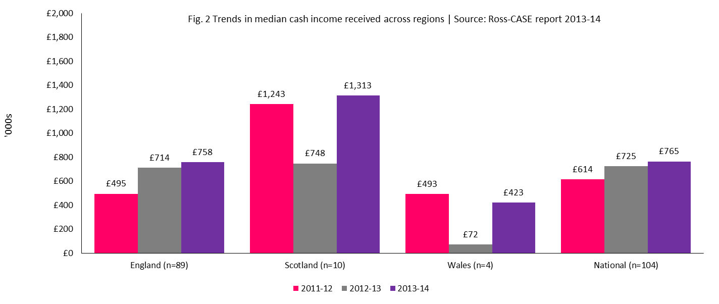Cash income received increased across the UK, including increases in the regions. The biggest jumps were seen in Scotland and Wales, where cash income received went up significantly from 2012-13 while the national median cash income and median cash income in England are experiencing a gradual ascent.