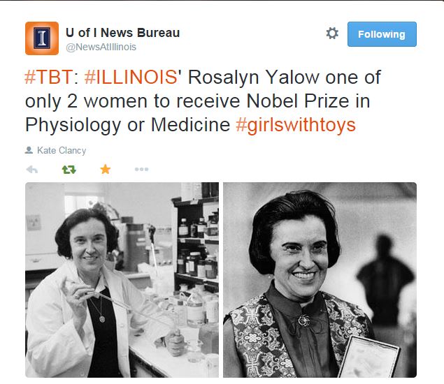 I still wanted to participate in the #GirlswithToys conversation, and remembered that Illinois alumna Rosalyn Yalow was one of only two women to receive a Nobel Prize in Physiology or Medicine.