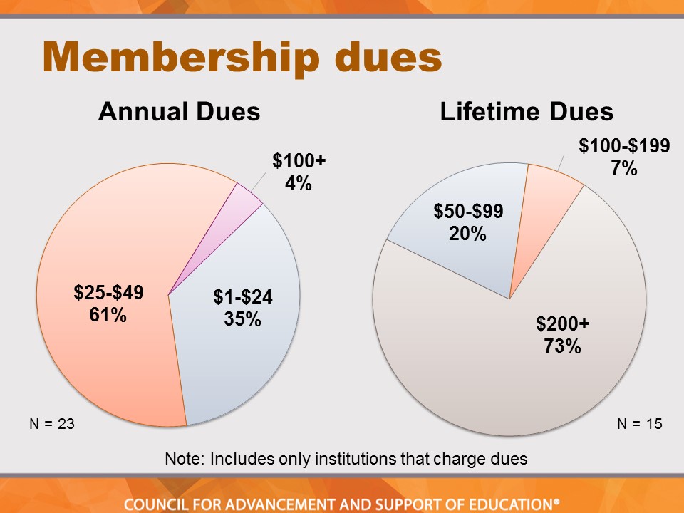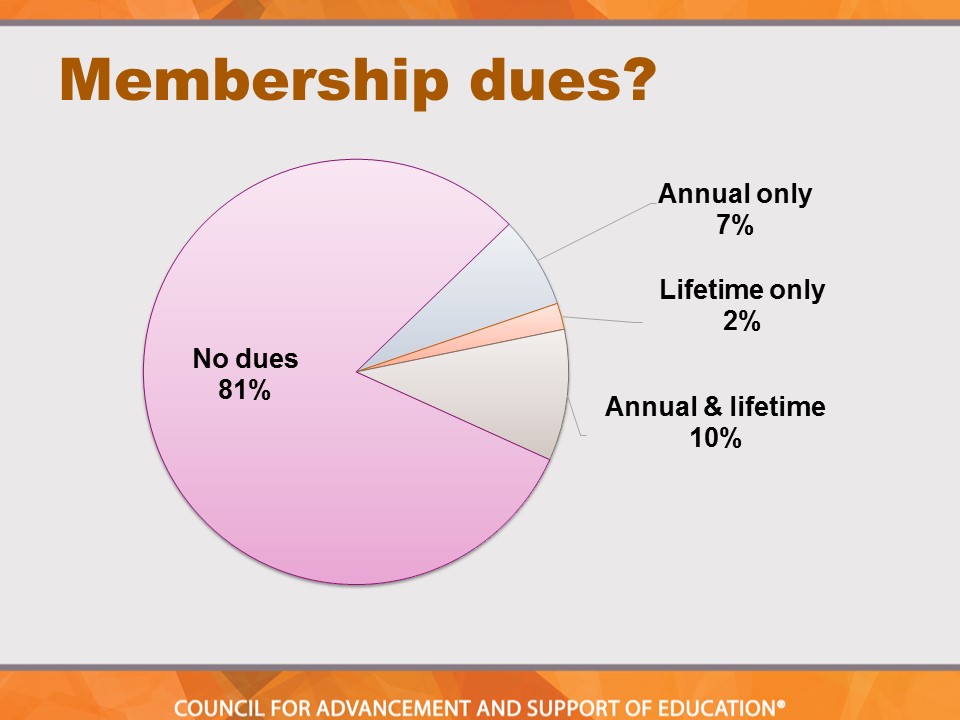 Findings indicate that community colleges are moving away from charging dues for alumni association membership. In 2012, 72 percent of respondents did not charge dues. That number increased to 81 percent in the most recent survey.